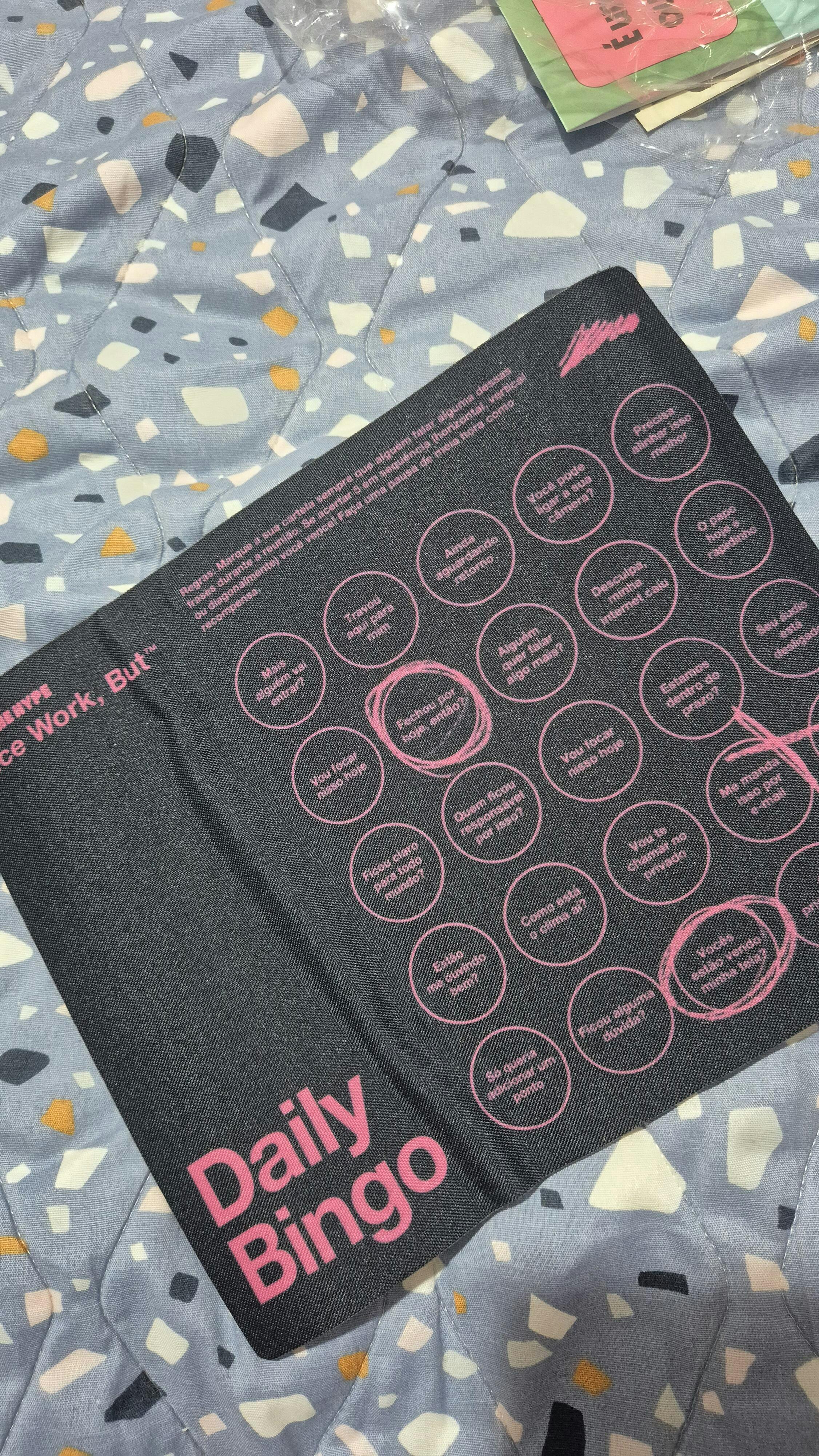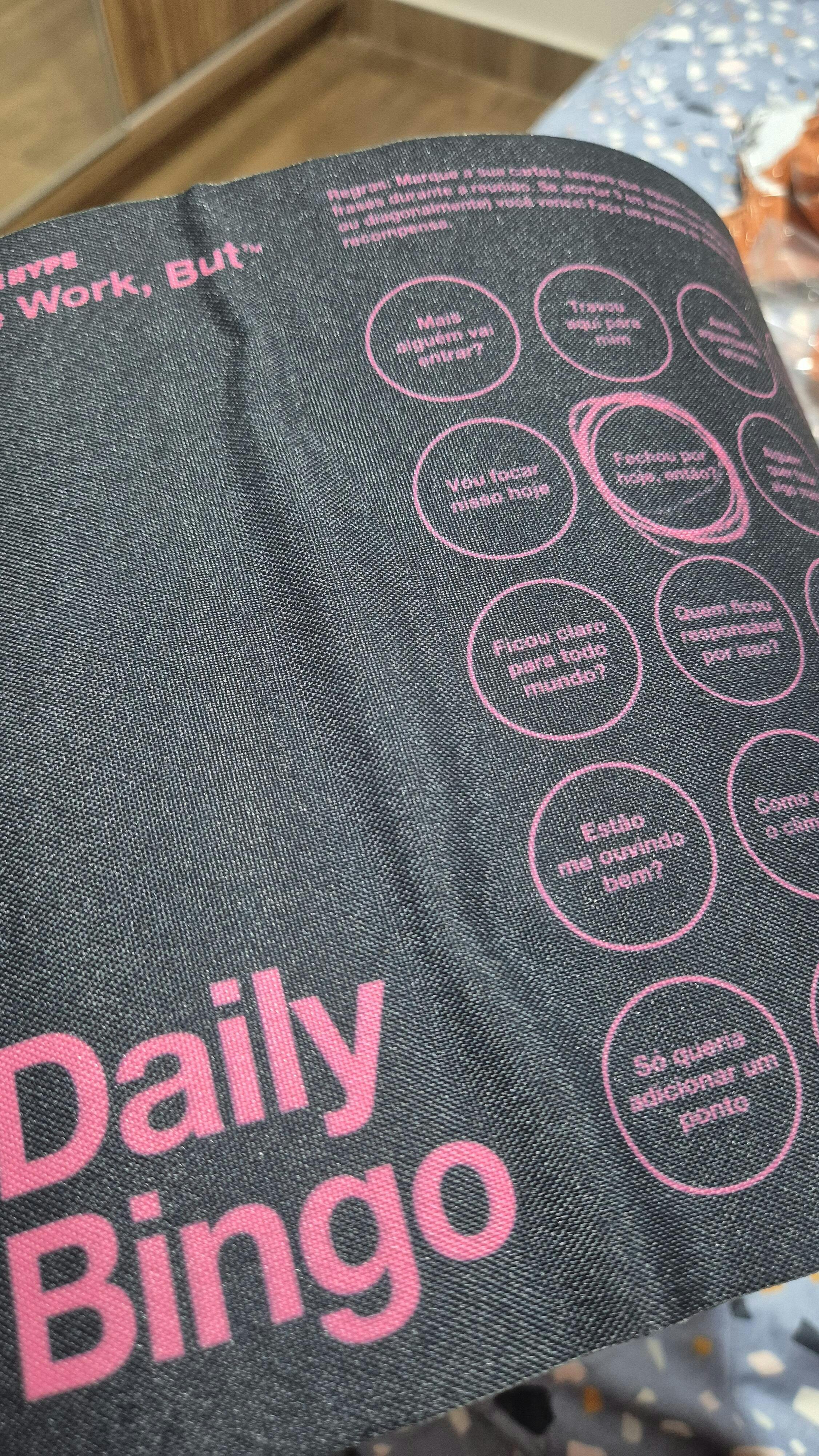O Mousepad Daily Bing é perfeito para te acompanhar naquelas reuniões de trabalho intermináveis. É só ficar atenta aos clichês de toda call, e ir anotando toda vez que uma aparecer. Acertando 5 em sequência (horizontal, vertical ou diagonal) você vence!